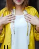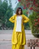Hannah Syed’s Mustard yellow dress. It is a silk coat with handmade pearl and chain embroidery, matching flared palazzo, and simple white inner. Suitable for formal and festive events.